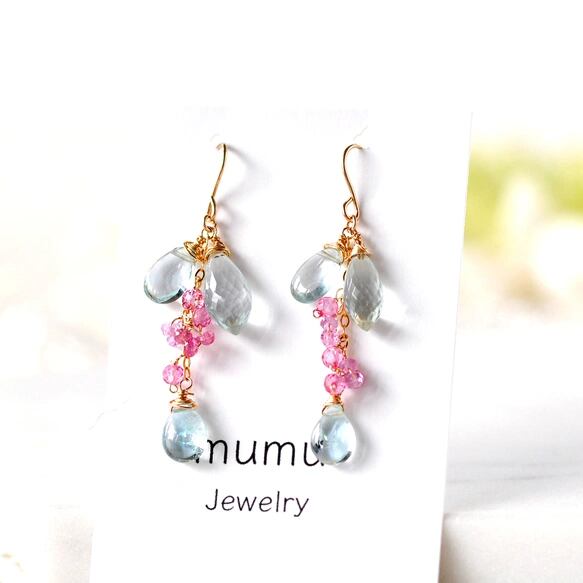 水彩の花 アクアマリンとピンクサファイア ピアス