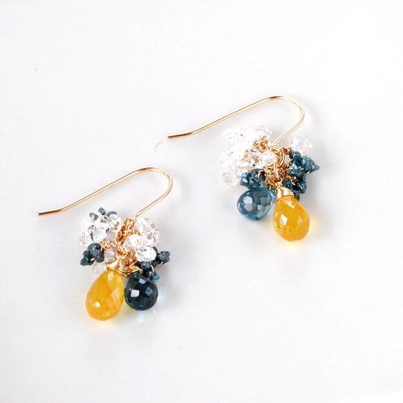華やかな輝きを放つイエローサファイアとロンドンブルートパーズに、ブルーダイヤモンドとハーキマーダイヤモンドをたっぷりと添え、ブーケのように仕立てた贅沢なピアスです。