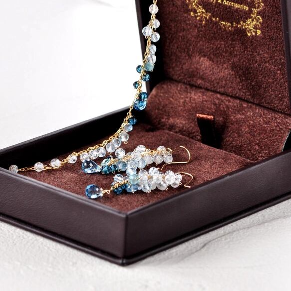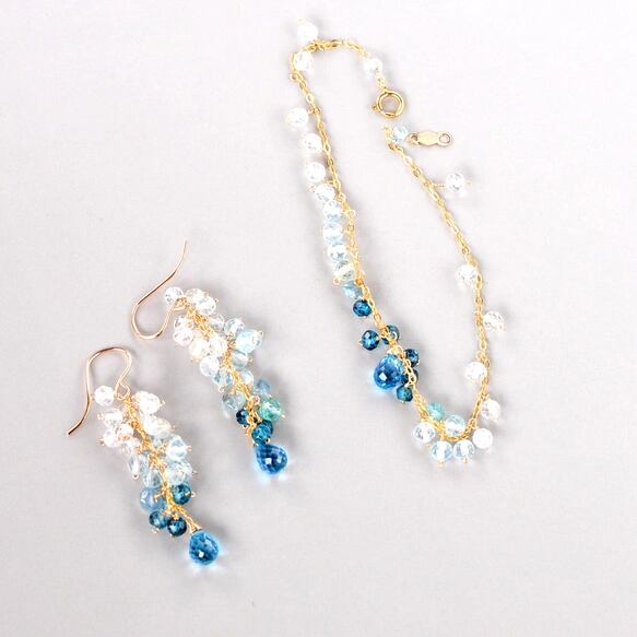 スイスブルートパーズの澄んだしずくを中心に、ロンドンブルートパーズ、ブルートパーズ、アクアマリン、ホワイトトパーズと、ブルーの濃淡が美しいグラデーションを描くブレスレットです。