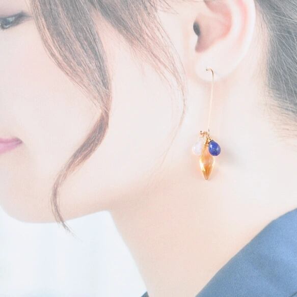 自然が育んだ3種の輝きを、しなやかなラインのキドニーフックピアスにセットしました。