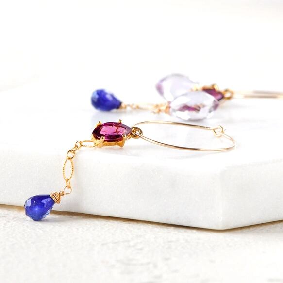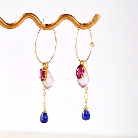 14kgf/天然石チャームセット ピンクアメジストxロードライトガーネットxタンザナイトフープピアス