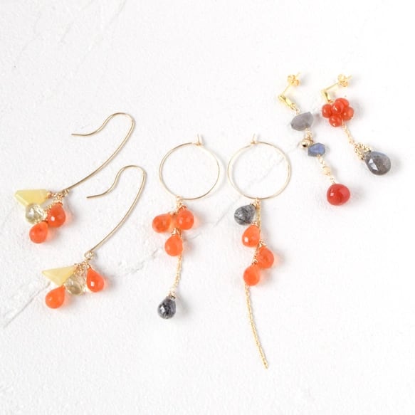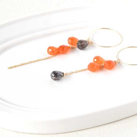 14kgf/カーネリアンxブラックルチルクォーツ アシンメトリーピアス