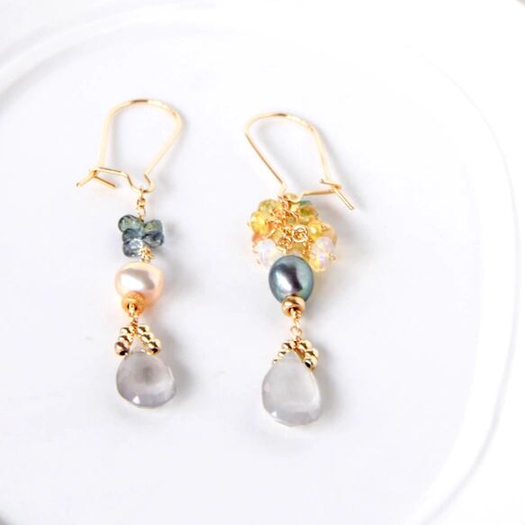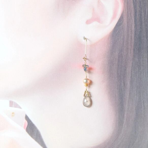 片方には、艶やかなピンクパール、そしてブルーがかったグリーンサファイアの小さなドロップを可愛く添えて。