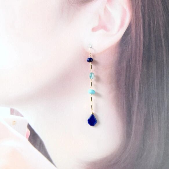 そんな情景を耳元に映した、ブルーカラーのアシンメトリーピアスです。
