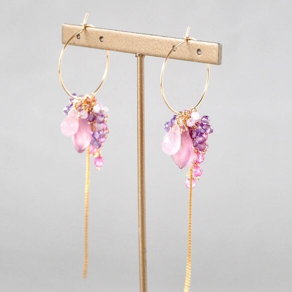 パープルとピンクの濃淡が織りなす、可憐でロマンティックなブーケのようなピアスです。