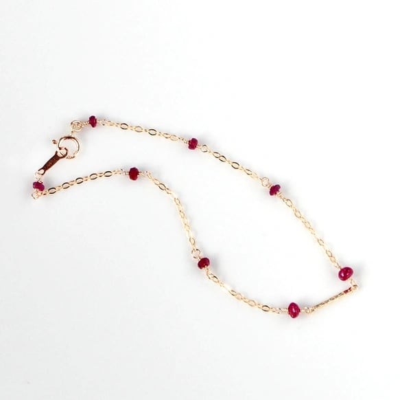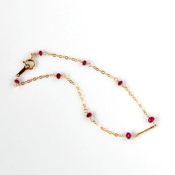 高品質の鮮やかな発色ルビーの小粒のロンデルに仕立て、繊細なゴールドチェーンで繋いだ華奢なブレスレット。