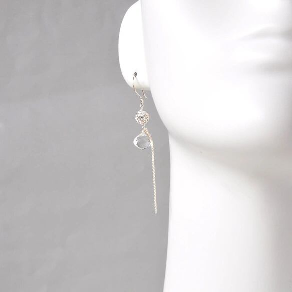 透明感あふれるクリスタルクォーツ(オニオンシェイプ・マイクロカット)に、眩い輝きを放つパヴェボールを組み合わせ、3連の繊細なチェーンをあしらったピアスです。