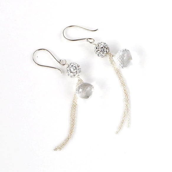 「夏の夜の煌めき」SV925スターリングシルバー/クリスタルクォーツxパヴェボールチェーンピアス