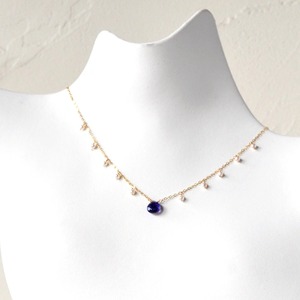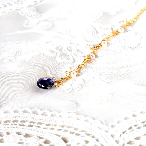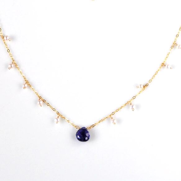 アイオライトのマロンシェイプ(マイクロカット)に、淡水パールを繊細にあしらった14kgfチェーンネックレスです。