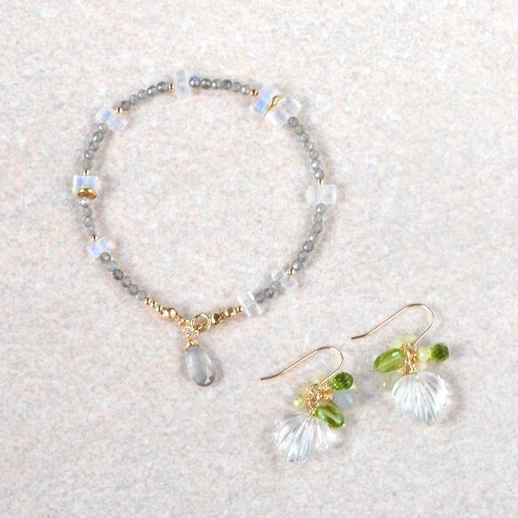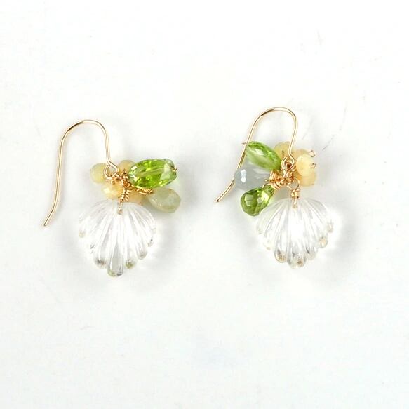 美しい透明感をもつクリスタルカービングに、爽やかなペリドット、やわらかなイエローオパール、上品なマルチカラーサファイアを添えて、若葉が芽吹く時の色、柔らかなグリーン色に染めた瑞々しいピアスに仕上げました。