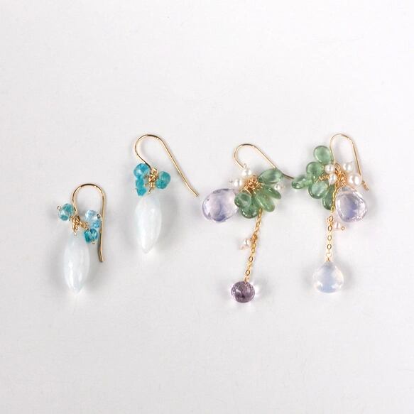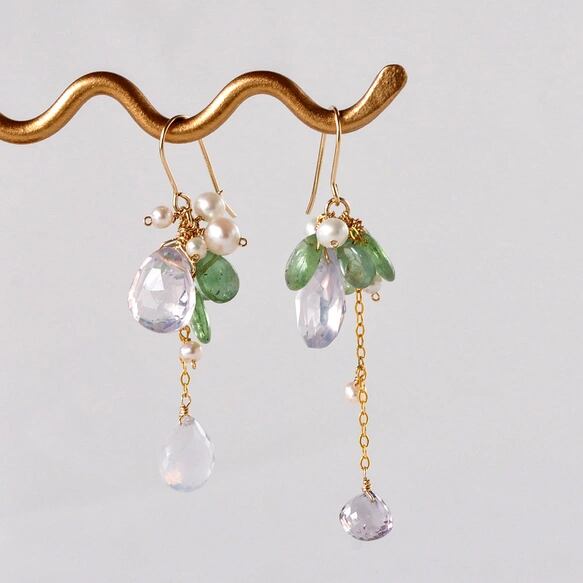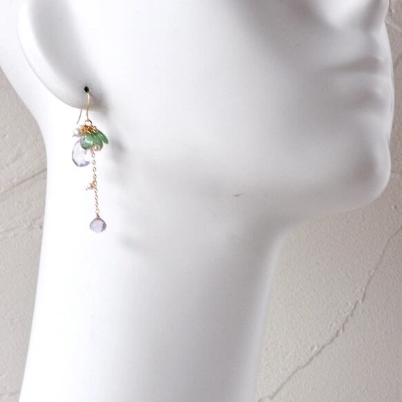 惚けるようにやわらかなラベンダー色のスコロライトと、瑞々しい輝きを放つグリーンアパタイトを組み合わせた14KGFピアスです。
