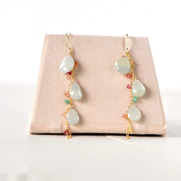 ライムグリーンサファイアと、小さな色彩のオレンジ・イエローサファイアを贅沢に連ねた14kgfシャンデリアピアス。