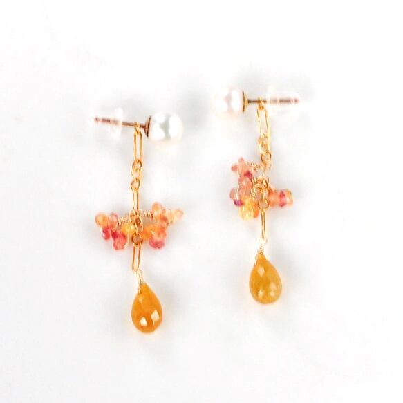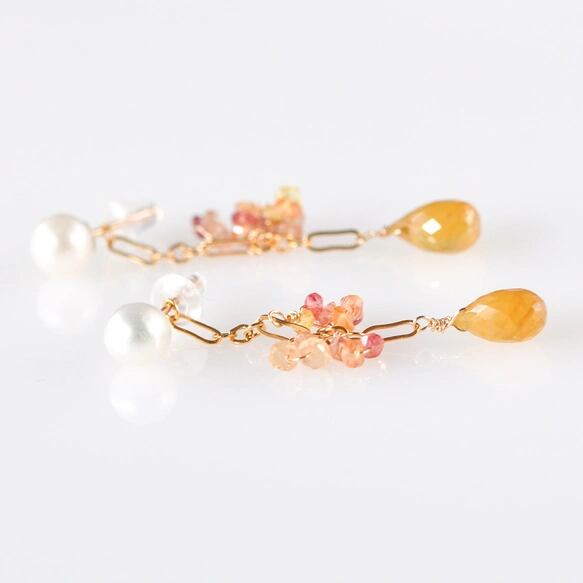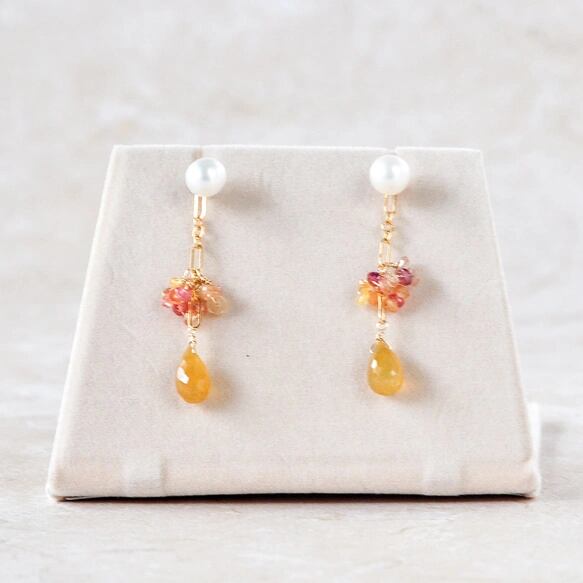・天然石:イエローサファイア(ブリオレット約9mm)、マルチカラーサファイア(イエロー〜オレンジ〜レッド)、淡水パール約6mm