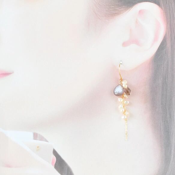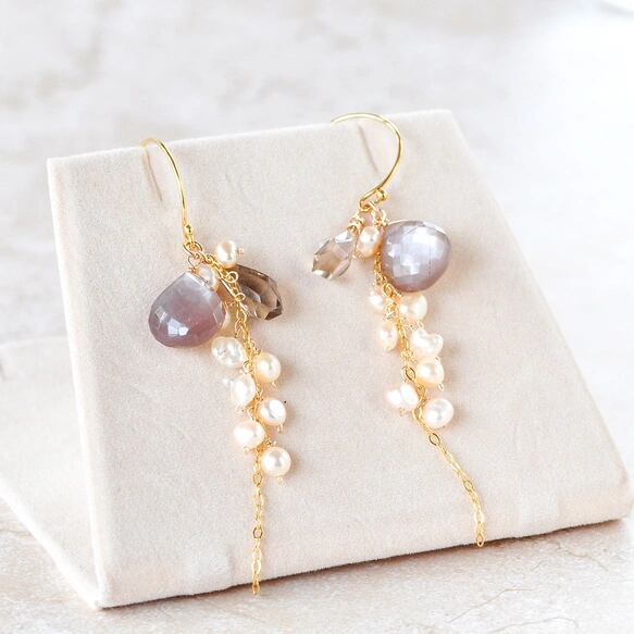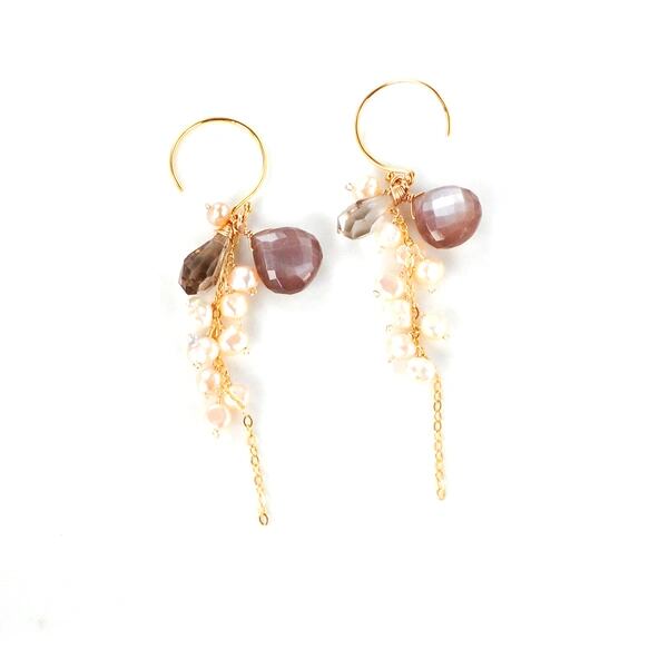 インド産の高品質チョコレートムーンストーンに、優しい艶めきのオフホワイトパールを束ね、きらりと光を拾うスモーキークォーツを添えたフックピアス。