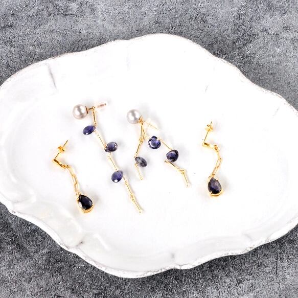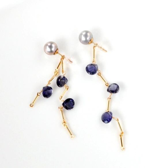 照りと艶の美しい淡水シルバーパールのスタッドから、ミニマルな1cmバーとアイオライトのマロンカットがリズミカルに連なり、モダンでアートピースのような佇まいに。