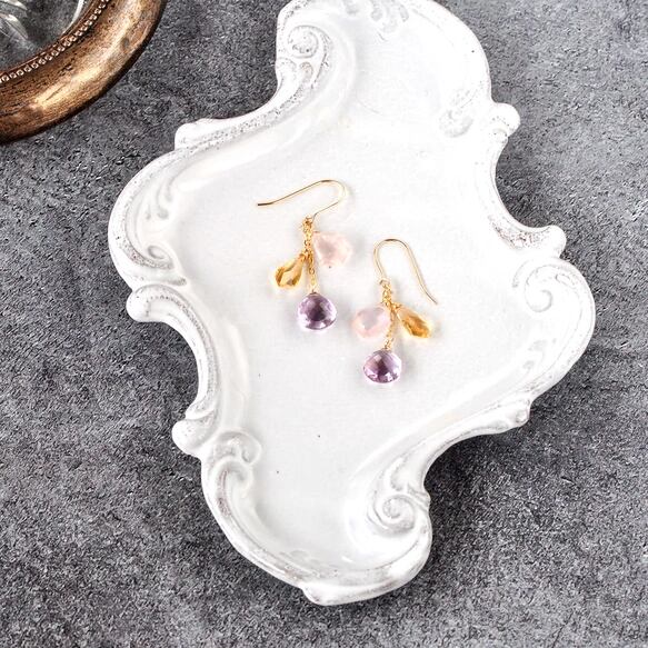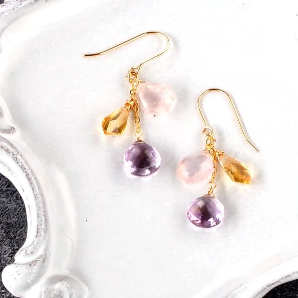 バイカラーが美しいアメトリンに、柔らかなピンクのローズクォーツ、そして秋色のシトリンを組み合わせた、シンプルながら印象的な14kgfピアスです。