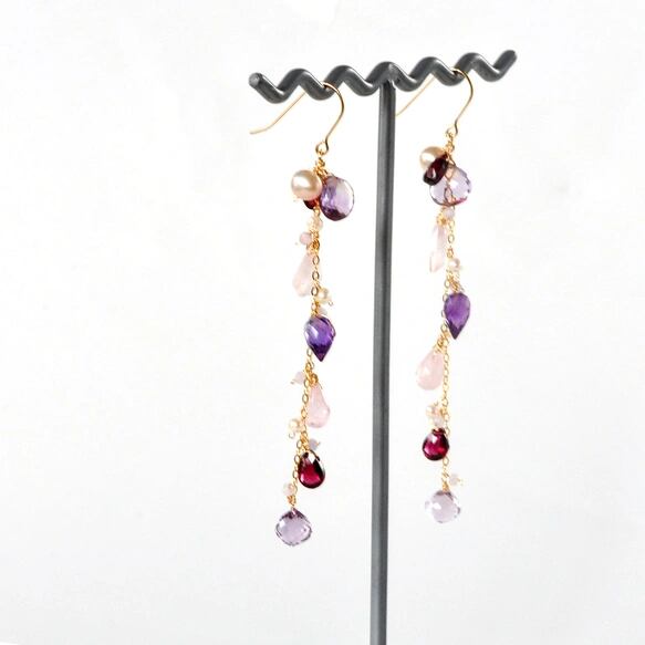 アメトリン、ロードライトガーネット、淡水ピンクパール、ローズクォーツ、アメジストフラワーバッド、モルガナイト、ピンクアメジストなど、選りすぐりの7種類の天然石を贅沢に使用しました。
