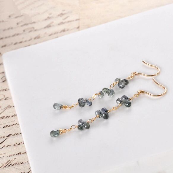 [海風の花しずく]グリーンサファイア・ティアドロップ花びらピアス14kgf