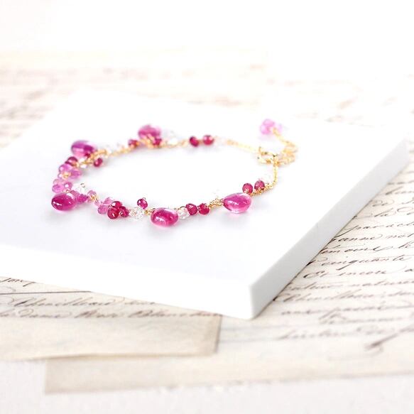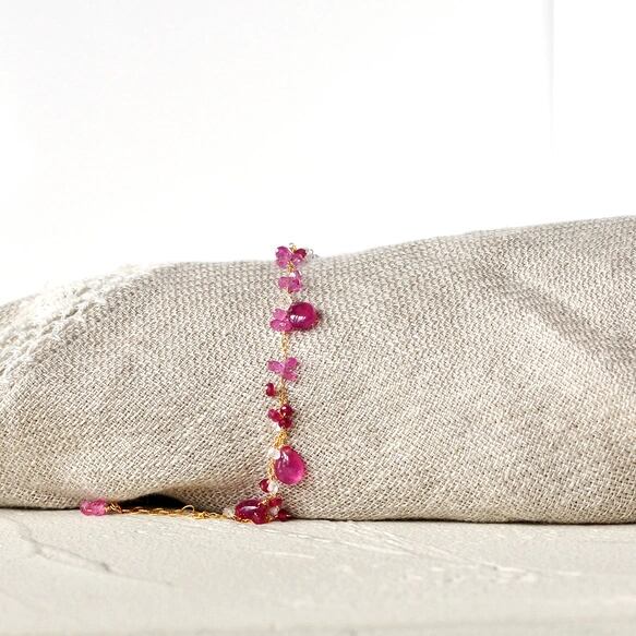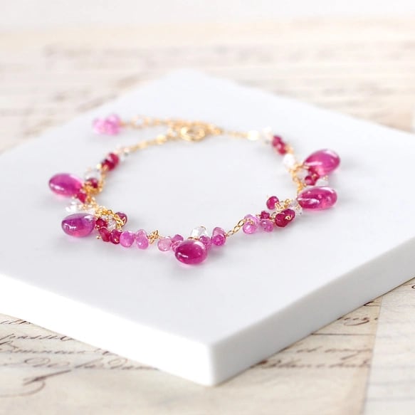 燃えるような深紅が美しいモザンビーク産ルビーに、ピンクサファイアブリオレットドロップをあしらいあ透明感あふれるハーキマーダイヤモンドと小粒のルビーを散りばめたブレスレット「紅耀(こうよう)」。