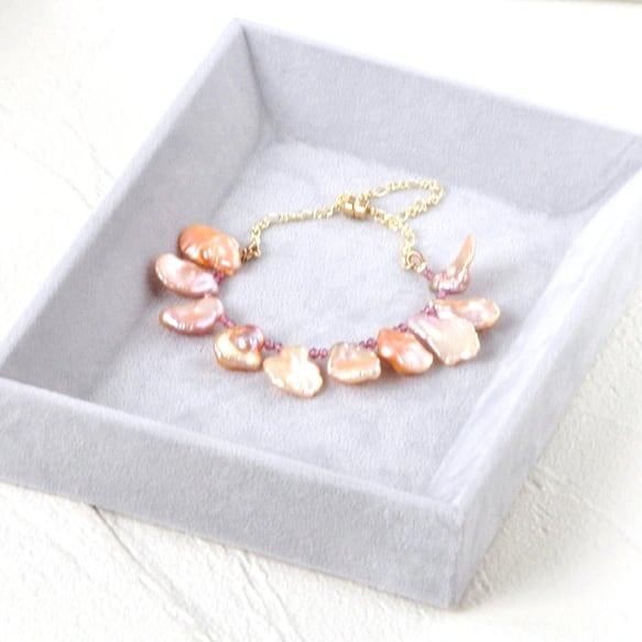 艶めく花びら淡水ケシパールピーチピンクのラグジュアリーブレスレット