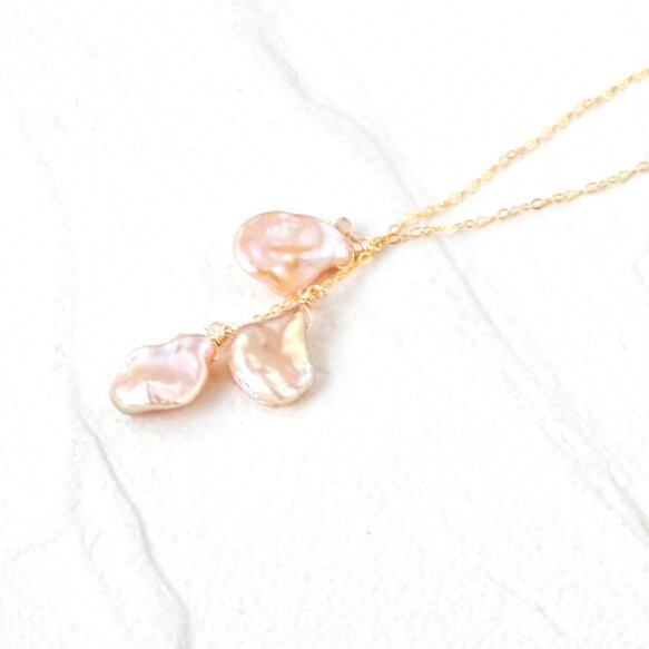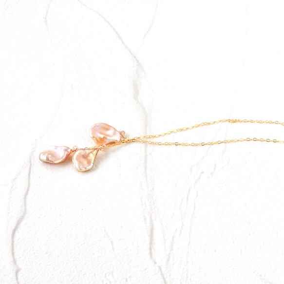 花びら淡水ケシパール ピーチピンク 3ピースカジュアルネックレス14kgf