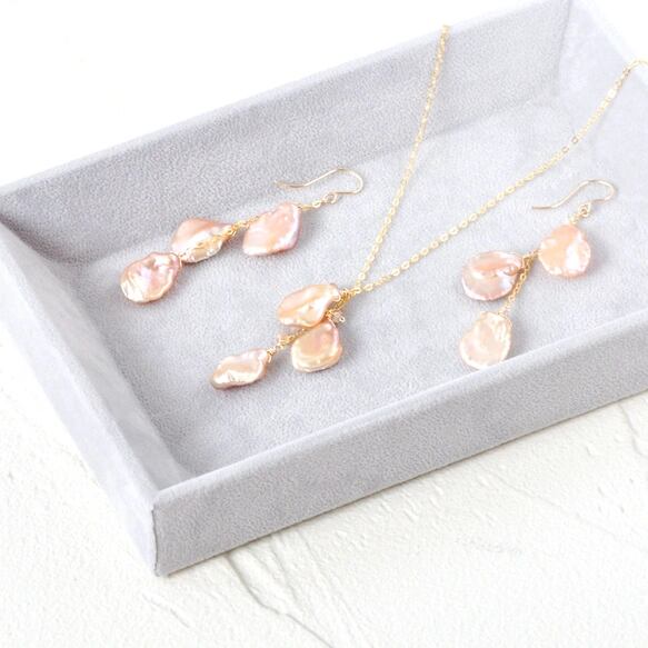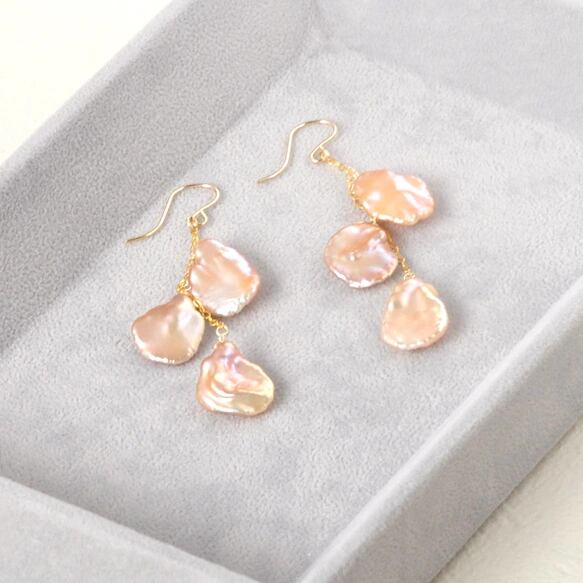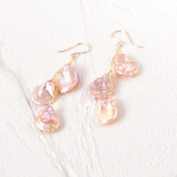 花びら淡水ケシパールピーチピンク 3ピースドロップピアス14kgf