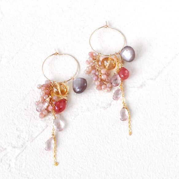 赤みを帯びたピンクのインカローズ、チョコレートのように艶めくチョコレートムーンストーン、はちみつ色のシトリン、