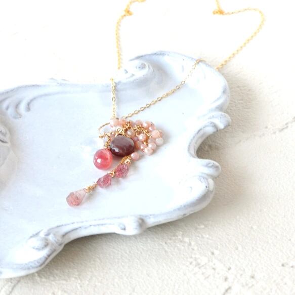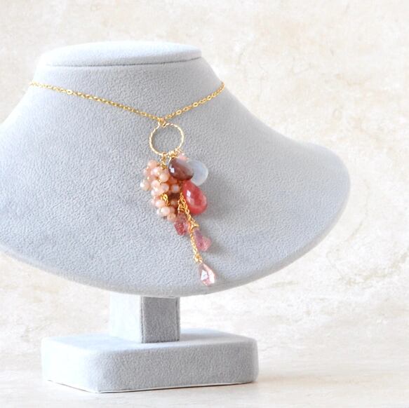そこに淡いピンクムーンストーンやストロベリークォーツを重ね、