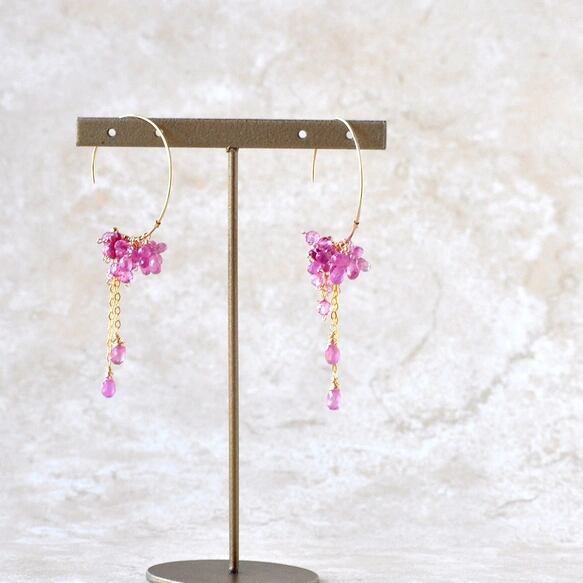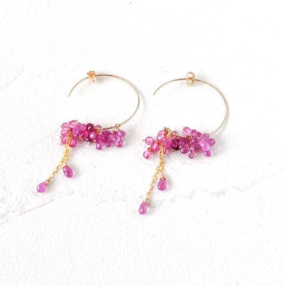 ピンクトパーズとルビーを添えた華やかなフープピアスです。