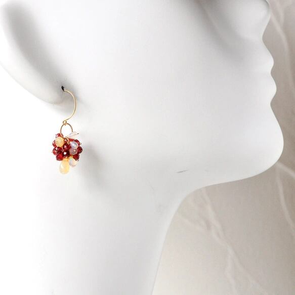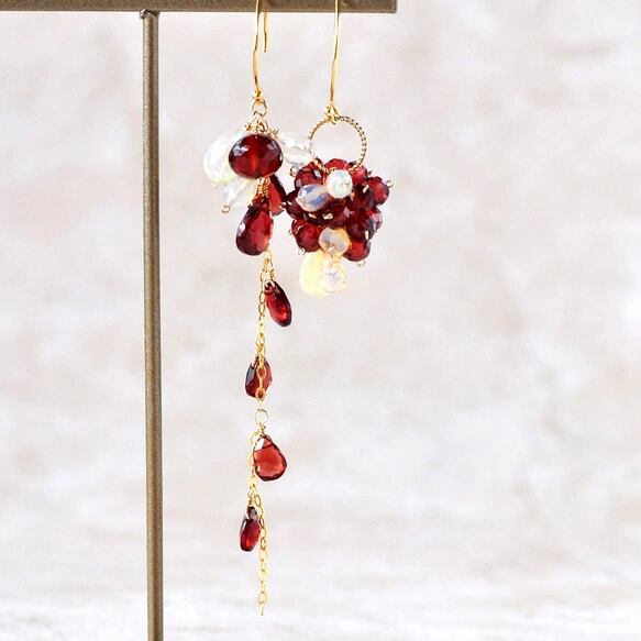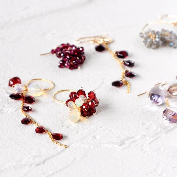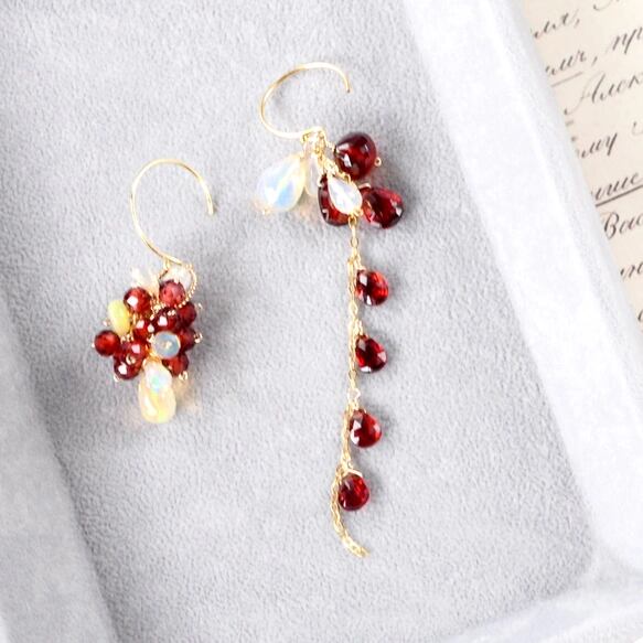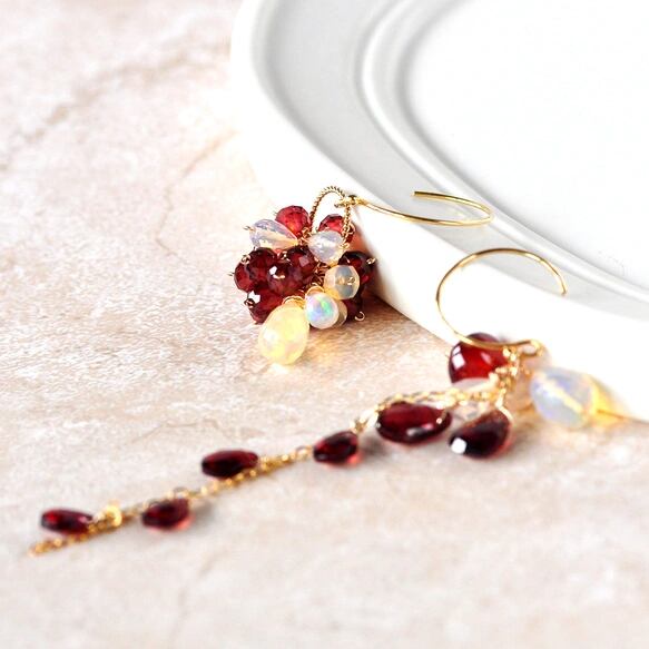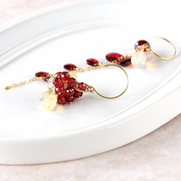 もう一方には、深紅のガーネットとプレシャスオパールを光の果房のように束ねました。