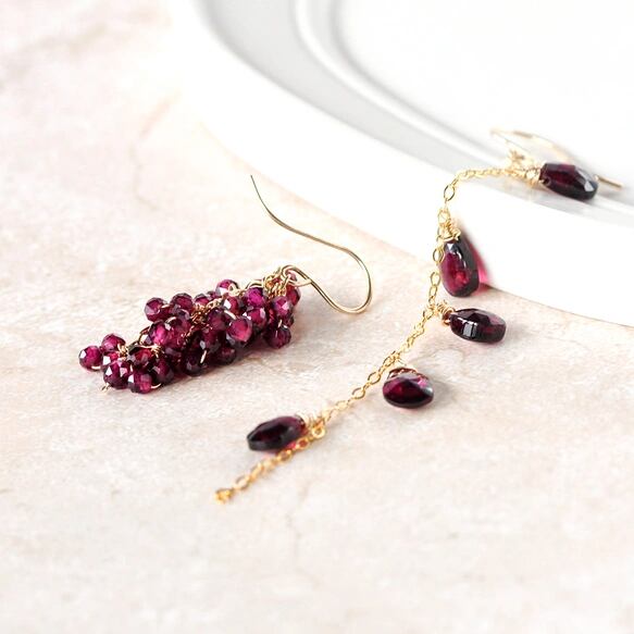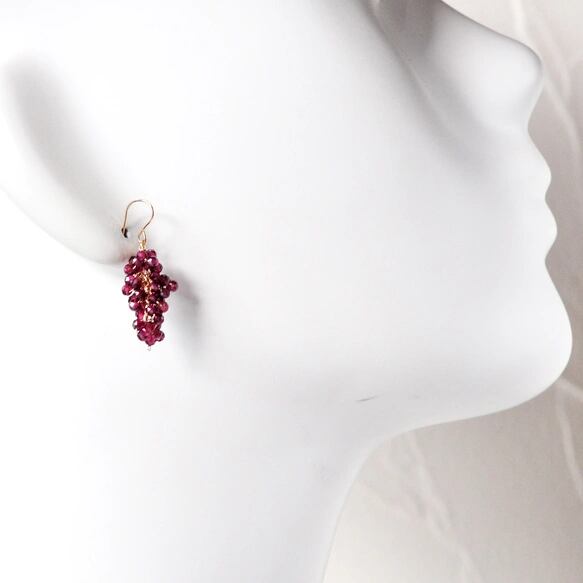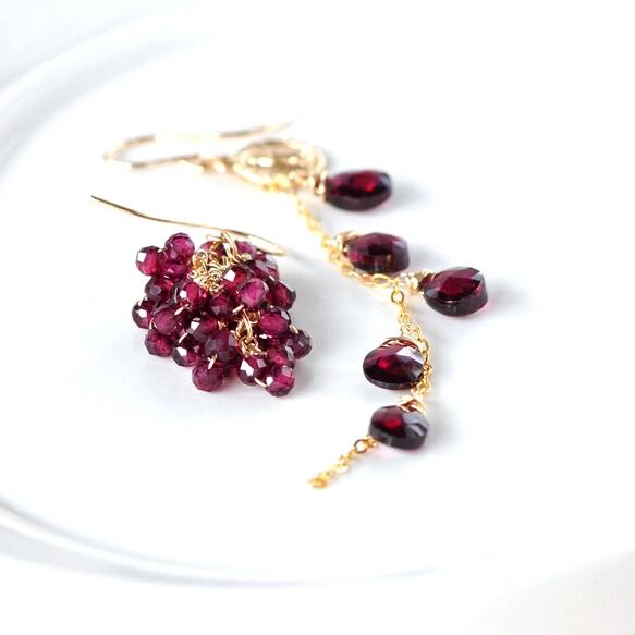 もう一方には、小粒のガーネットを果房のように繊細に束ね、耳元に瑞々しい立体感を添えました。