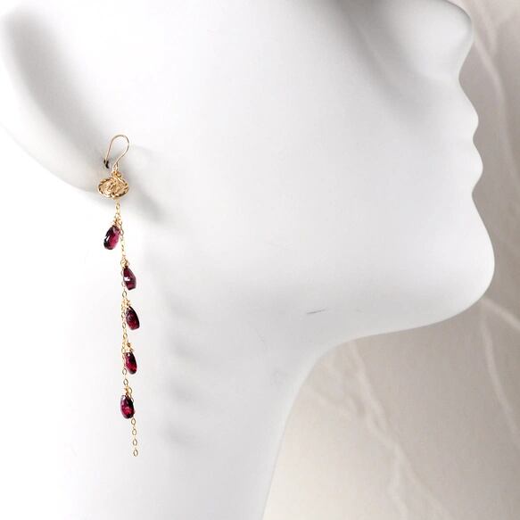 片側にはペアシェイプのガーネットを連ね、流れるようなラインで光を映すロングデザイン。