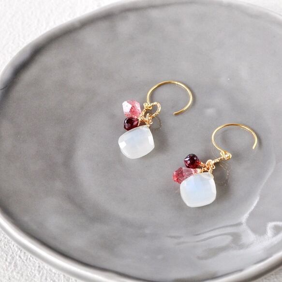 ・天然石:ホワイトムーンストーンリーフシェイプ15mm/レッドガーネット5mm/ストロベリークォーツランダムドロップ9mm