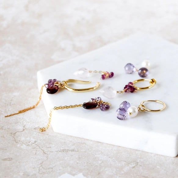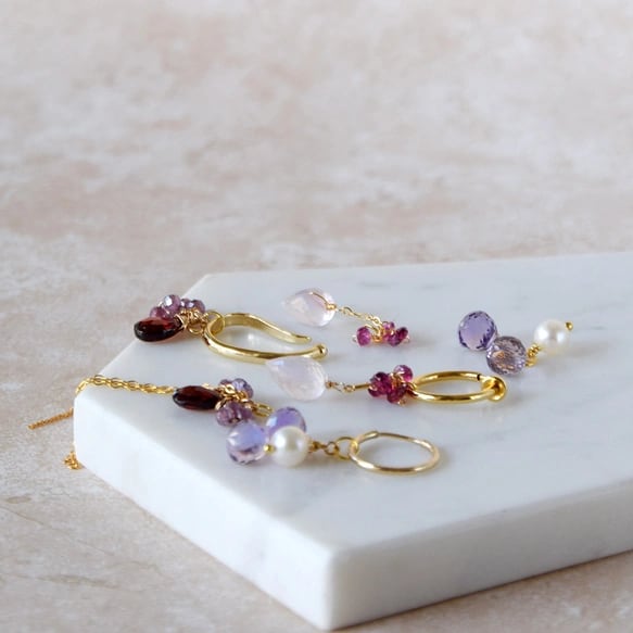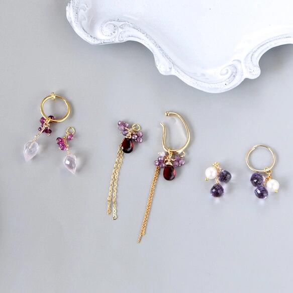 14kgf花雫の余韻 Pink Amethyst / Garnet / Rose Quartz 3種イヤーチャームセット