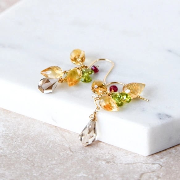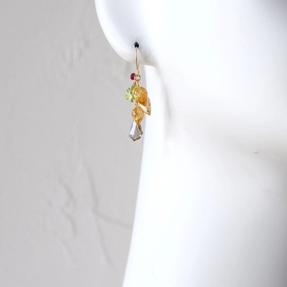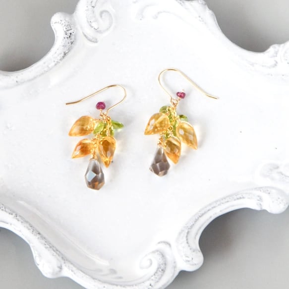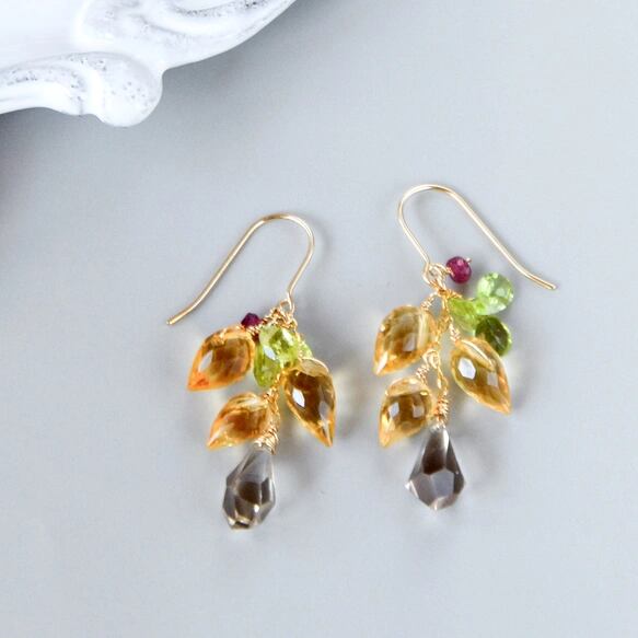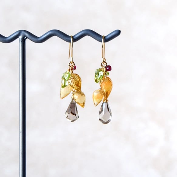 ・天然石:シトリンフラワーバド9〜8mm/ペリドットペアシェイプ6mm/スモーキークォーツラフドロップ10mm/ルビー3mm/