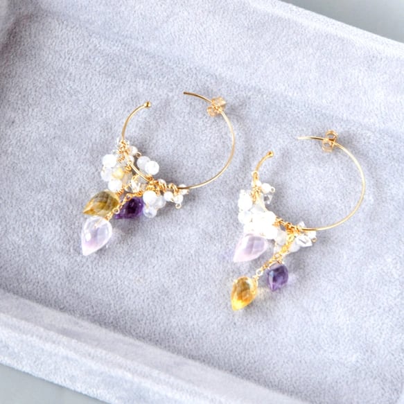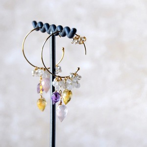・軽やかな存在感 フープ×小粒ストーンの組み合わせで、揺れ感はありつつ上品。日常にも特別な日にも。