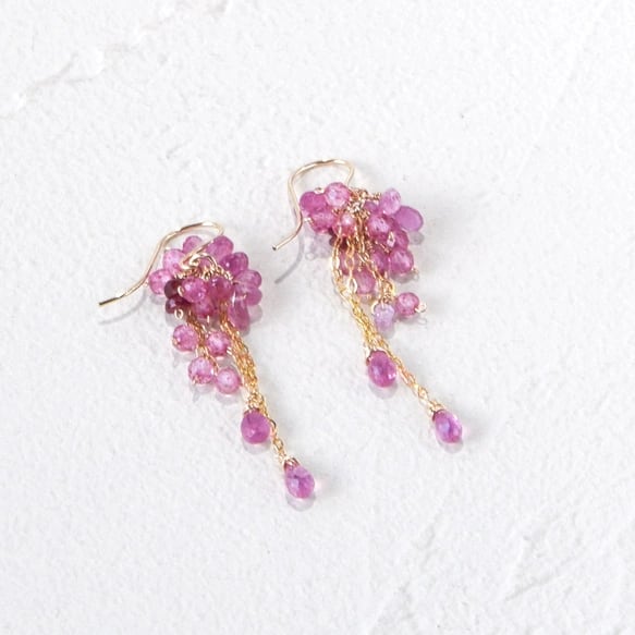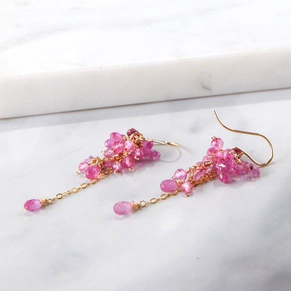 こぼれ落ちる桜のブッケットーピンクサファイアxルビーピアス 14kgf