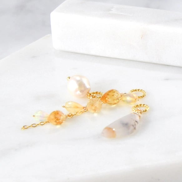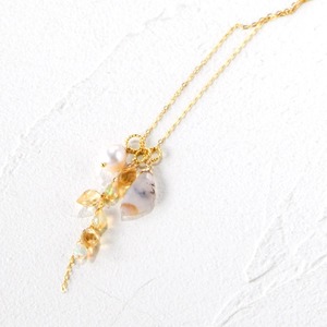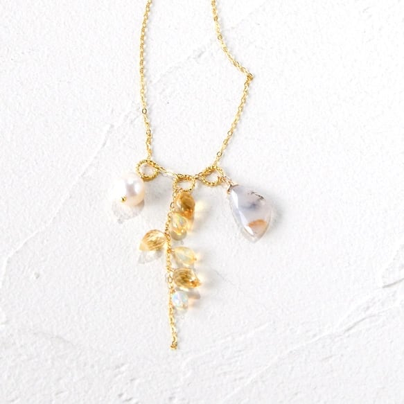 乳白色の中に、枝や苔のような自然の景色を描くデンドリティックオパールを主役に、やわらかな黄金色のシトリン、虹色の遊色が美しいプレシャスオパール、