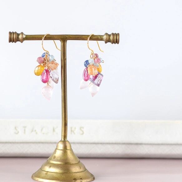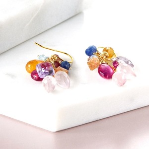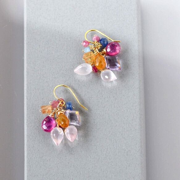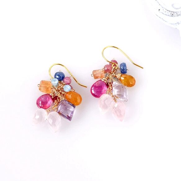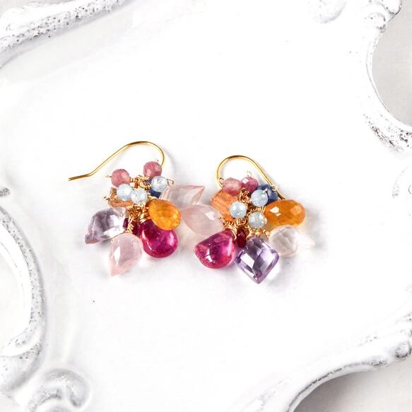 透明感のある天然石を幾重にも重ね、アクセントにビビッドなルビーを添えた、陽光溢れるピアスです。