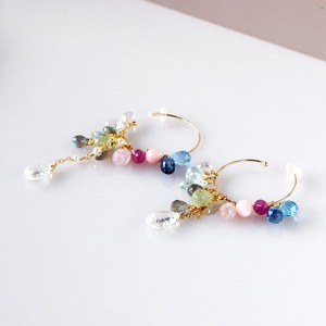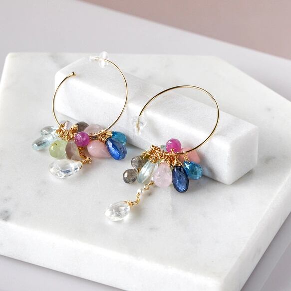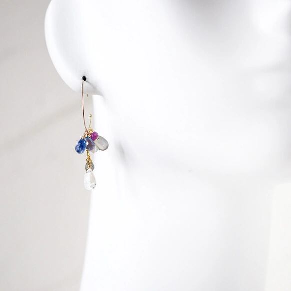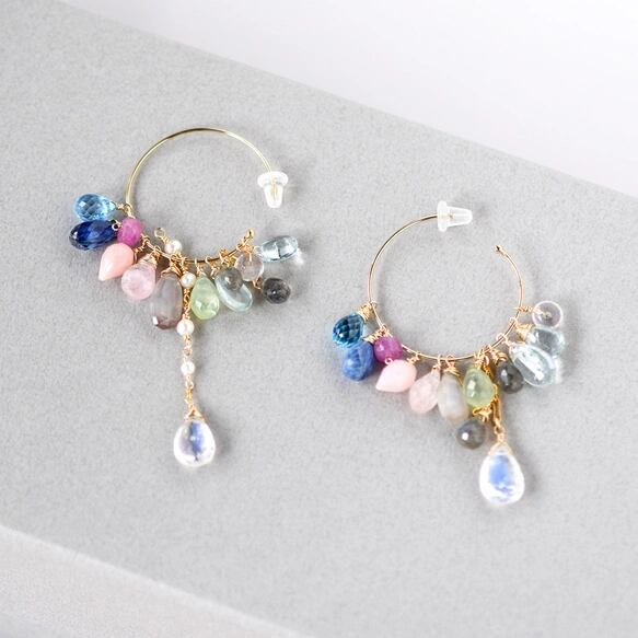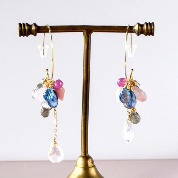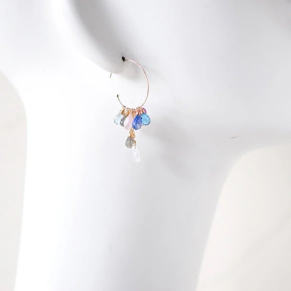 蒼と薔薇色の余韻 ―スイスブルートパーズxレインボームーンストン多彩石フープピアス14kgf