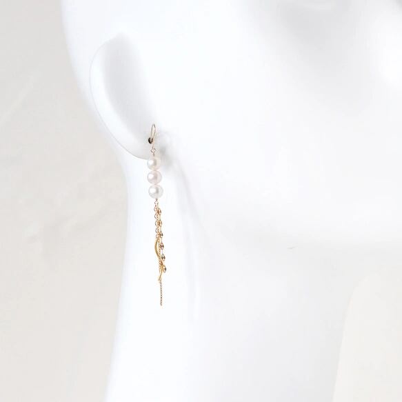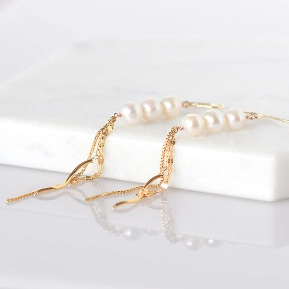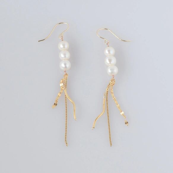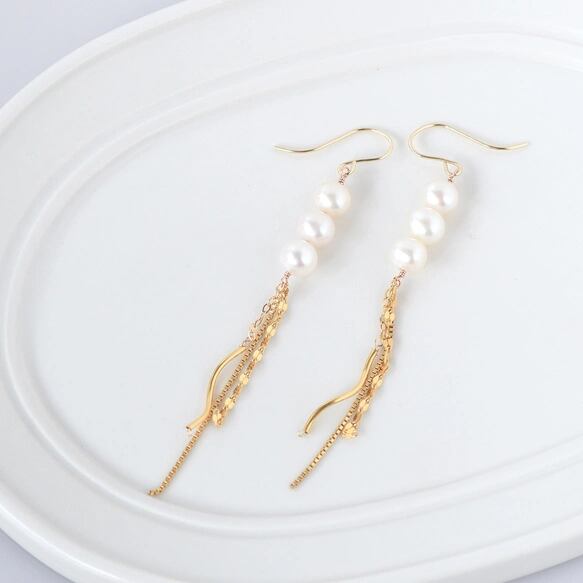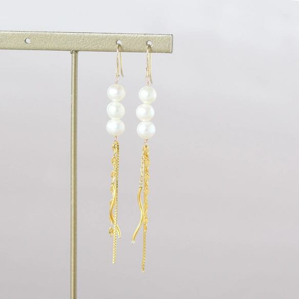 淡水パール ロングピアス 14KGF 揺れるゴールドチェーンと3粒パールの上品ピアス