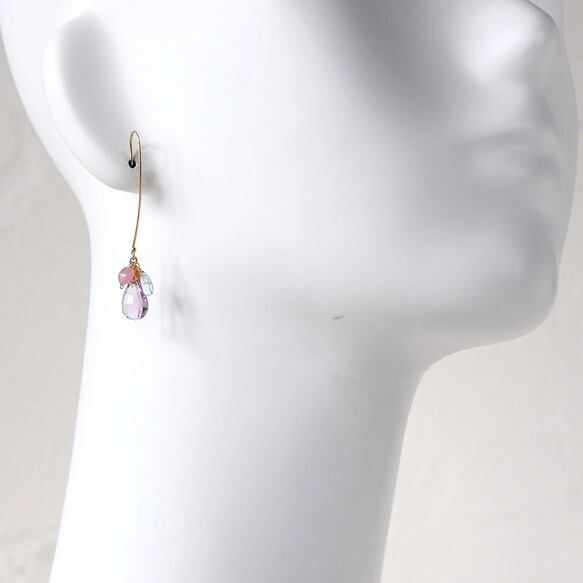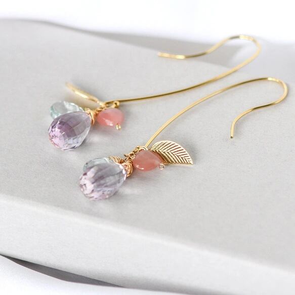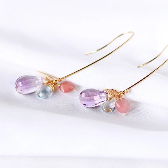 大粒アメトリンの雫ロングピアス アクアマリンとハートクォーツ / 14kgf