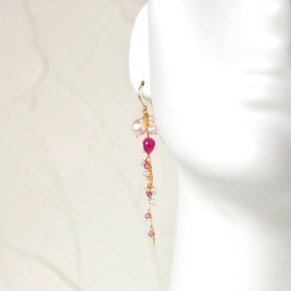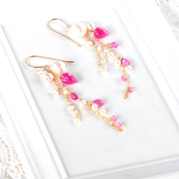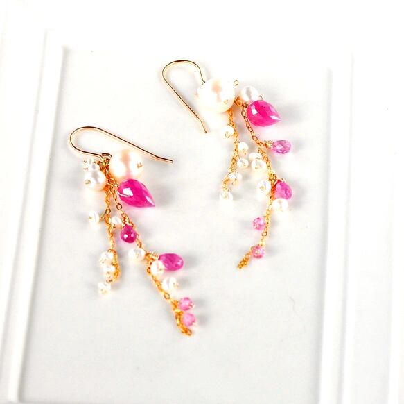 鮮やかなルビーとアコヤパール、小さなパールをたっぷりと飾った夏ピアス。