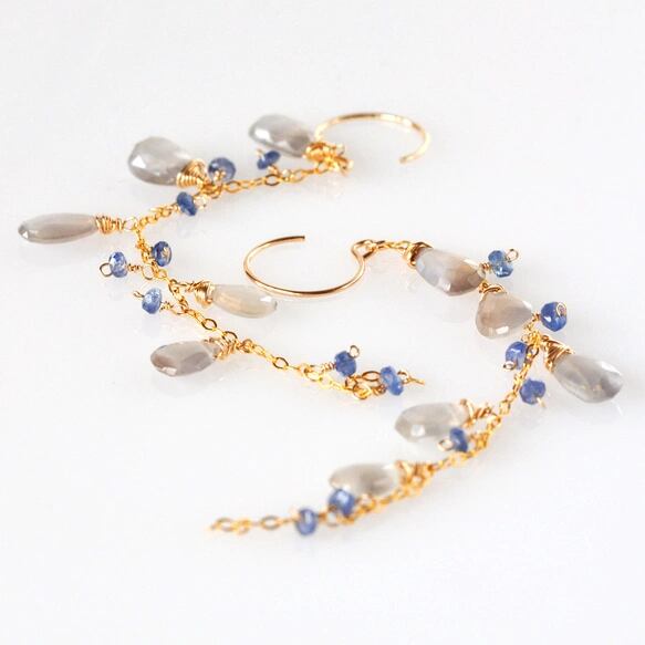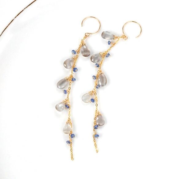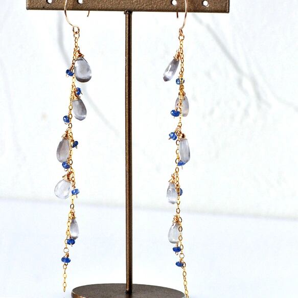美しいシラーが瞬くようなセイロンムーンストーンと柔らかな色合いのブルーサファイアをチェーンに散りばめたロングピアスです。