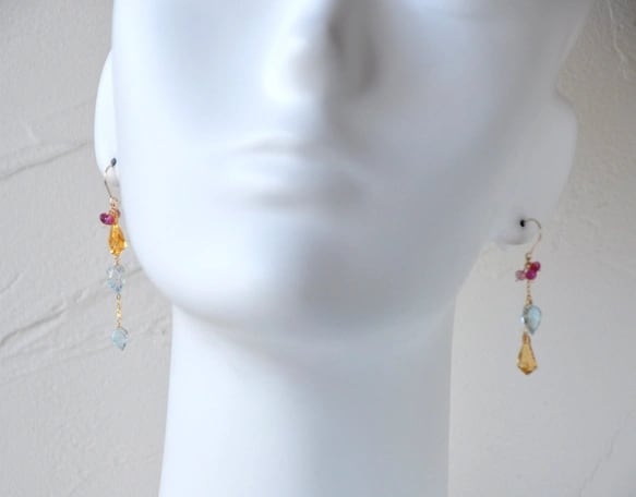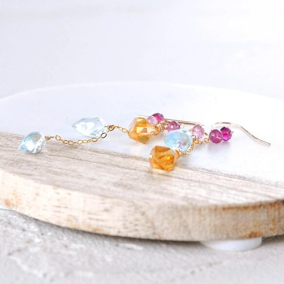 14kgf/ シトリンxブルートパーズxトルマリン アシンメトリーピアス