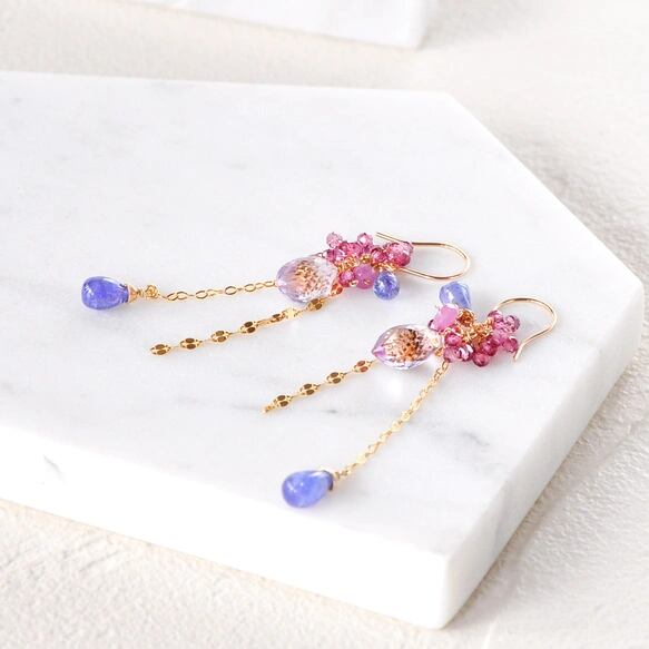 14kgf/ピンクアメジストシャンデリアカットxタンザナイトピアス