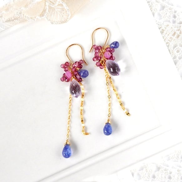 とタンザナイト、ロードライトガーネットの小粒をたわわに飾ったピアスです。