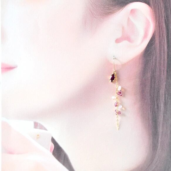 14kgf/薔薇色グレープガーネットxプレシャスオパール華奢なピアス