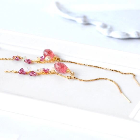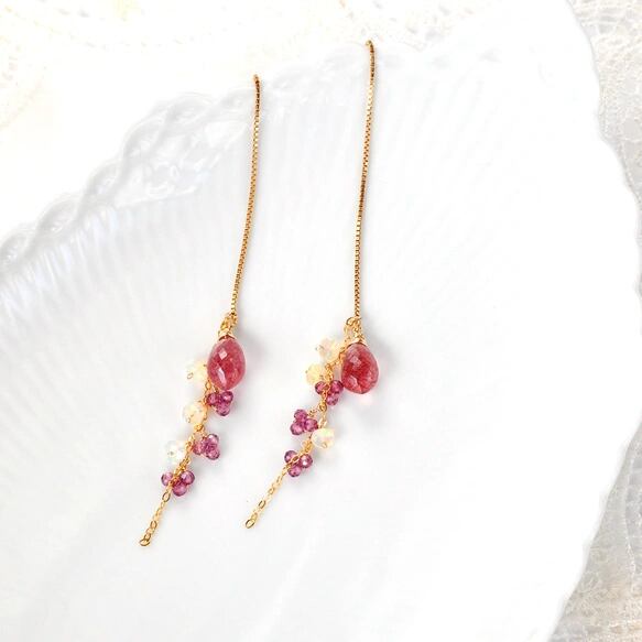 14kgf/アメリカン2WAYチェーンピアス(ストロベリークォーツxロードライトガーネット)