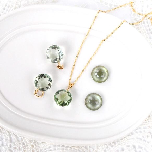濃く美しいグリーンのラウンドカボションビーズは、カットの美しさが際立ち、見る角度によって表情が変わるリバーシブルデザイン。